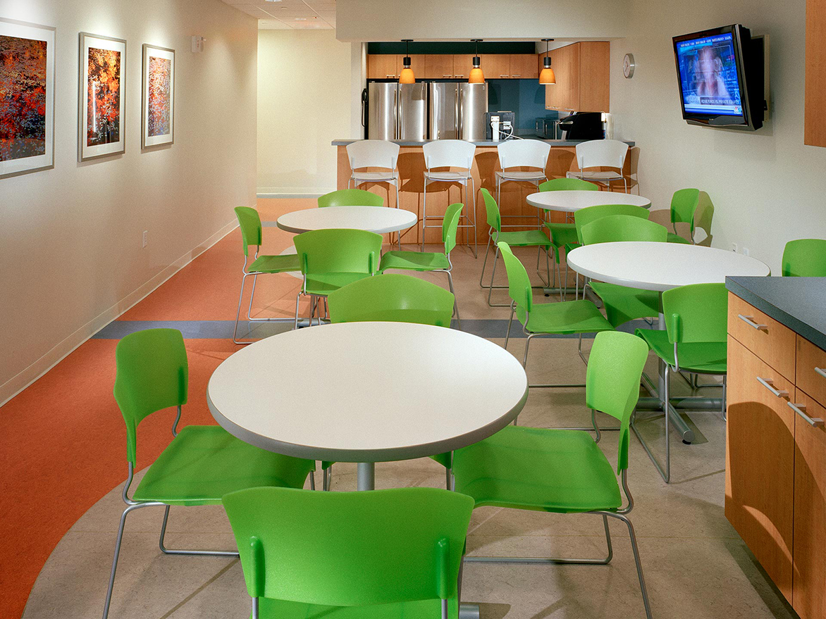 Centrally located, the break / lunch room was designed in contrast with the neutral palette using bright colors and modern appliances. Conference rooms are available for presentations and private meetings.