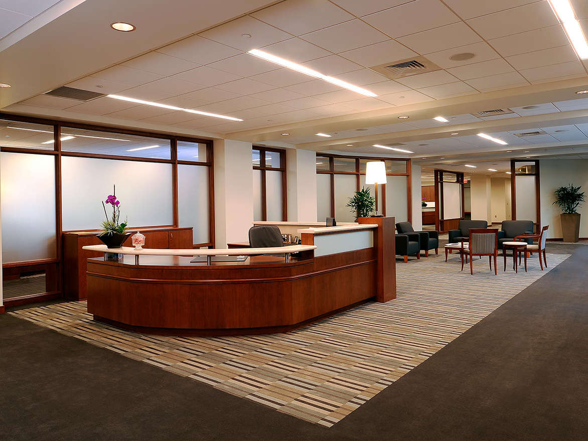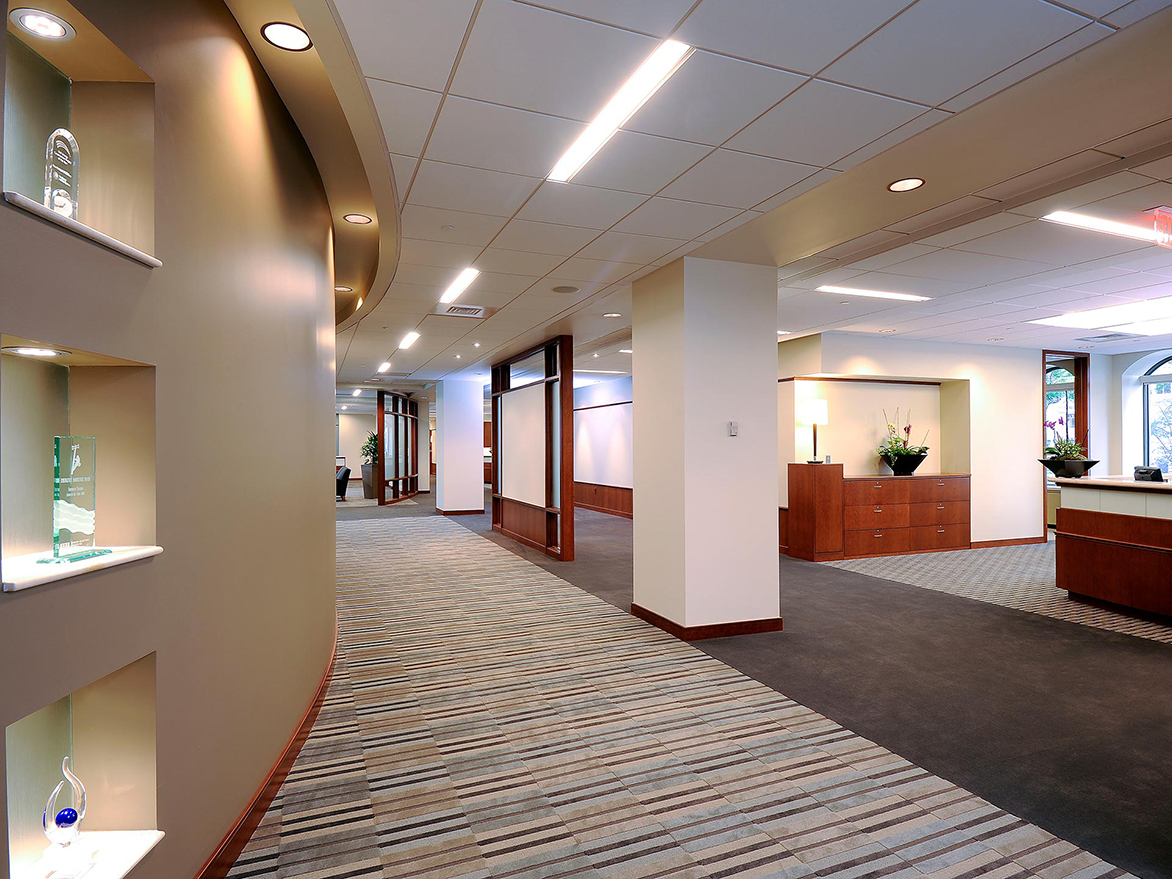 The new floor plan features a spacious lobby and curved display wall, anchoring six surrounding offices, administrative areas and conference rooms. Modern glass partitions set in traditional wood frames divide the large space into smaller sitting and support areas. The client’s goal to maintain the integrity of the historic building was achieved by restoring and replicating existing molding and keeping as much of the original details as possible.
